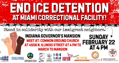 We will gather at Common Ground Midtown church at 4pm on Sunday, February 22nd. The address is 4550 N. Illinois Street. There will be a short program to center everyone on the meaning and tone of this public witness action. We will then proceed to the Governor’s Mansion, one block east at 46th and N. Meridian Street, with chanting and song at approximately 4:45pm and will remain until 6:00pm.