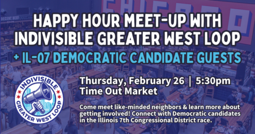 Can’t make it? Details for our next meet-up are coming soon! If you haven’t yet, [join our mailing list](https://www.indivisiblegwlchi.org) to ensure you’re up to speed on all things Indivisible Greater West Loop.