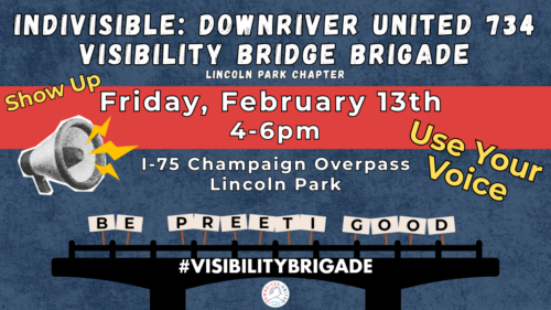 On Friday, February 13th from 4–6 PM, Indivisible: Downriver United 734 is taking to the overpass for a Visibility Bridge Brigade and we need YOU with us.