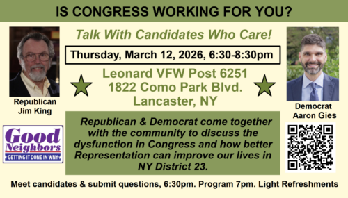 The public is welcomed and encouraged to join Republican Jim King and Democrat Aaron Gies, candidates for Congress in NY 23 as they discuss the issues and challenges facing our district and how conscientious, community forward representation will help to improve the lives of all who call WNY home.