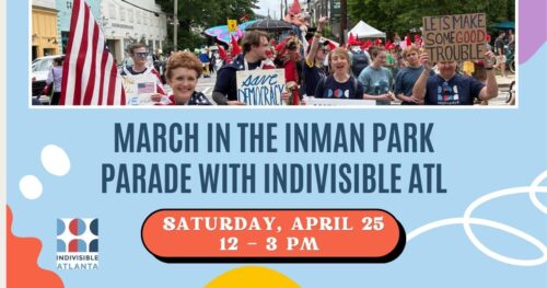 Join Indivisible ATL and our allies to march in the Inman Park Parade! This fun, family-friendly opportunity is a great opportunity to show members of our community how many Atlantans are willing to stand up for democracy.