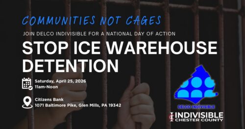 Join Delco Indivisible, Chester County Indivisible and No Kings Springfield as we gather at 11 AM on April 25 at the Citizens Bank in Glen Mills for a National Day of Action to stop ICE warehouse detention. We are raising awareness about the role that Citizens Bank plays in supporting GEO and their for profit detention centers.
