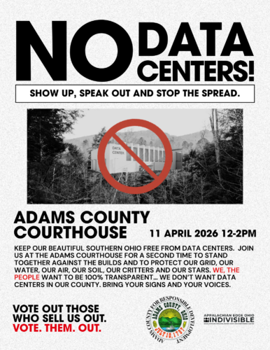 Make your banners, make your signs. Be informative, direct and show our local leaders that we will not allow a data center in our county or in southern Ohio. Let’s stop the spread. If you’re in and surrounding Adams County, we hope to see you on April 11th.