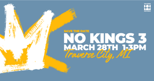 We’ll update this page with specifics on format, exact location, and ADA accessibility as soon as they’re finalized. You’ll also be able to visit our No Kings 3 info site at https://traverseindivisible.org/event-info. Stay tuned!