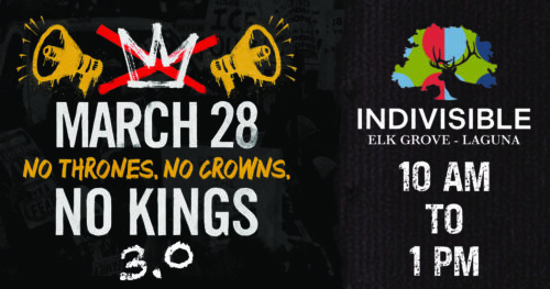 Indivisible Elk Grove Laguna is once again hosting a protest on No Kings 3.0 day, March 28th from 10:00 AM to 1:00 PM. Our protest will be held in front of the DSW located at Bruceville Rd. and Laguna Blvd. There is plenty of parking in the area and restrooms in the shopping centers at all four corners of this intersection. We had an estimated 2400 protesters for the No Kings 2.0 Nationwide protest, let’s make 4800 at No Kings 3.0 in Elk Grove, California! Bring your signs, your noisemakers, your family and friends and let’s say it loud: no thrones, no crowns, no kings. We’re not watching history happen—we’re making it. Join us!