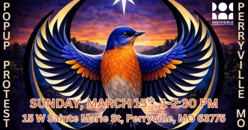 There will be a pop-up protest from 1-2:30pm Sunday, March 15th, at the Perry County Courthouse Square in Perryville, MO. Bring a flag and/or a sign that shows that you oppose Trump’s constant efforts to consolidate power, stomp out dissent, and dismantle democratic checks and balances. Bring your friends, family and neighbors – let’s find our community and build a coalition!