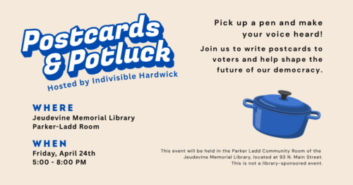 Join Indivisible Hardwick for a postcard-writing event! We’ll have everything ready for you – just show up, grab a pen and start writing.