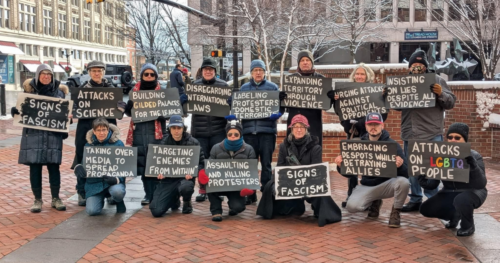 Please wear all black or dark clothing and plan to carry a prepared sign. We will walk and stand as a group in the downtown area with the Signs of Fascism signs; if mobility is a concern, you can stand or sit with a sign. Plan to remain silent for key parts of the silent vigil.