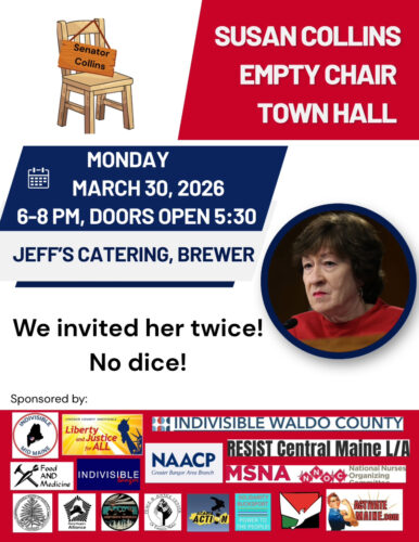 Susan Collins hasn’t held a Town Hall in over 25 years. She is supposed to represent Mainers, yet refuses to face her constituents. That’s why Indivisible Bangor, alongside many other co-sponsors, is holding one for her. Enough is enough – it’s time YOUR voices are heard. We’ve invited Senator Collins to attend twice, but we’ve received no response.