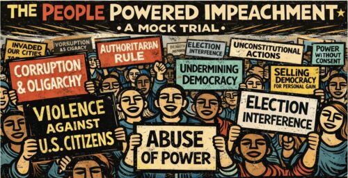 The People Powered Impeachment Mock Trial is a rigorously scripted, fact-based fully staged reading depicting an imagined impeachment trial of Donald J. Trump. The audience will act as the Senators who vote to convict or acquit. The evidence and witness are grounded in the Constitution and current events. We use testimony, documented record, and factual sources to argue the impeachable crimes of Donald J. Trump. We also use modest amounts of humor, satire and irony, as tools for survival and solidarity.