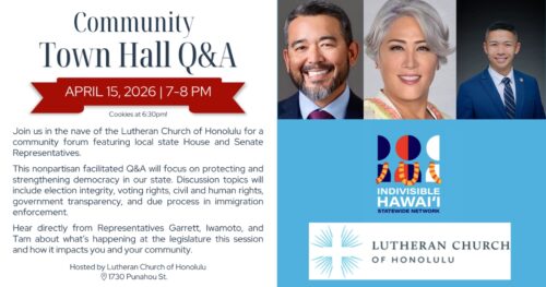 Join us in the nave of Lutheran Church of Honolulu for a community forum featuring local State House and Senate Representatives.