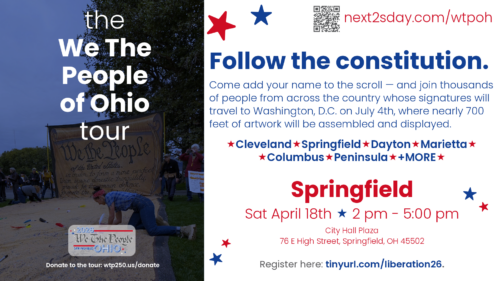 Constitution to communities across Ohio, April through June 2026. Come add your name to the scroll – and join thousands of people from across the country whose signatures will travel to Washington, D.C. on July 4th, where nearly 700 feet of artwork will be assembled and displayed.