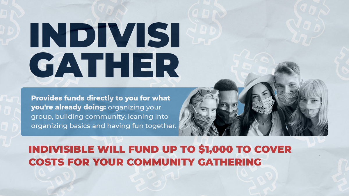 That’s why we’re launching our largest ever reimbursement program, IndivisiGather, to provide funds directly to you for what you’re already doing: organizing your group, building community, leaning into organizing basics and having fun together. You and your Indivisible group can access a reimbursement of up to $1000 to cover costs for a gathering. Picnics, barbecues, ice-cream socials, coffee chats, beach gatherings, hikes, virtual get togethers, etc. Whatever members of your group like to do — find some time to do it together!